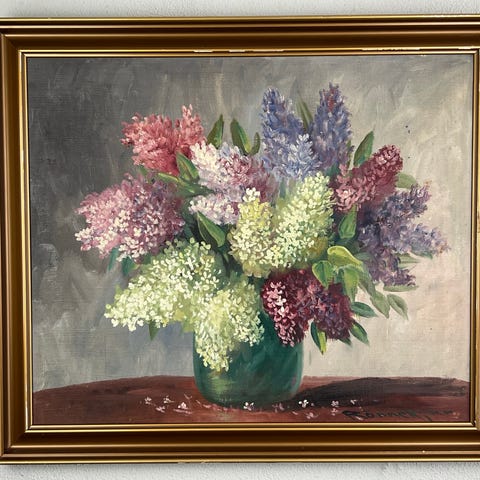 Oliemaleri, Hans Rønnekjær, motiv: Blomster/Have, stil: Naturalistisk, b: 66 h: 53,5, Smuk blomster opstilling fra kunstmaleren
