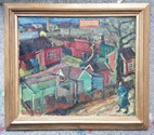 Oliemaleri, ERIK BRANDT, motiv: Landskab, stil: Ekspressionisme, b: 70 ur h: 62 ur, Erik Brandt. Kolonihave. Der findes flere kunstnere med samme navn. Denne EB mener jeg er svenskeren født 1901 og død 87. Signeret, indrammet og i fin stand. Malet på masonit.