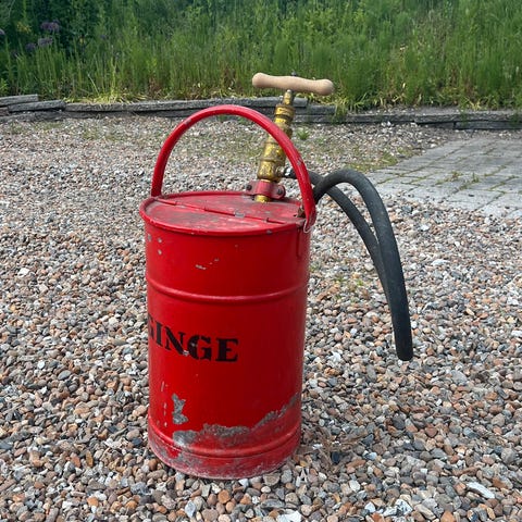 Gammel retro hånd brandsprøjte, fuld intakt med retro håndtag,brandslange,metalbeholder ,metallåg.