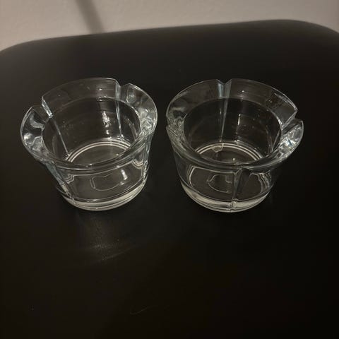 Højde 10cm, diameter 9 / 4,5 cm. Glasset kan tages op. Prisen er for begge stager. Kan sendes for købers regning. Kan afhentes i Birkerød og København K