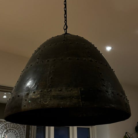 Rustikt udtryk og med kædeophæng og baldakin i jern/metal.