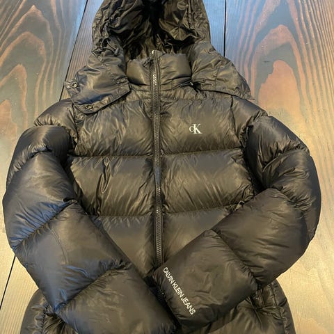 Vinterfrakke, str. 42, Calvin Klein, Sort, Dun, Næsten som ny, Rigtig fin sort Calvin Klein dame vinterjakke med pels på hætten, den er str large, er fuldstændig som ny…