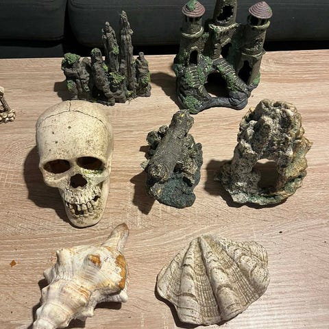 Dekoration, b: 15 d: 12 h: 10, Kiste, skattekiste til akvarie, låget vipper op hvis der placeres en iltsten inde i kisten, ellers er den med succes brugt som mallehule.