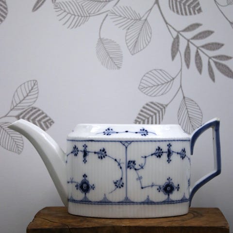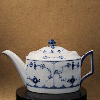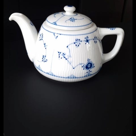 Porcelæn, Te kande, Royal Copenhagen, Oval tekande, Kgl. Musselmalet halvblonde Kongelig porcelæn. Royal Copenhagen Musselmalet halvblonde. Sjælden gammel Tekande nr. 1/684. længde 21,7 x 9 cm. Højde med låg 12,5 cm.