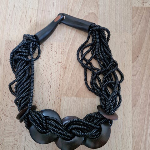 B) Lang halskæde af sort horn og nakkestykke af læder.