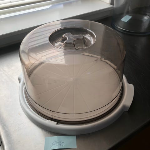 Skønt skønt orange kagefad i plastik med låg ligeledes i plastik. Indvendig diameter er 27 cm og den udvendige er 30,5 cm. Fadet måler 10 cm i højden.