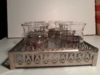 Glas, Te/kaffe glas, Duralex, Franst sæt fra 1940-50erne bestående af 6 glas (tåler kogende vand) med holdere og tilhørende metalbakke med 2 håndtag og bund i presset glas. fin stand. 28(32)x20x4,5cm. (lot 125).