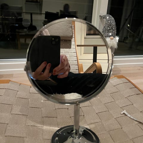 Forstørrelsesspejl på den ene side, alm. spejl på den anden side.