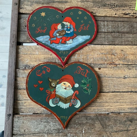 Julehjerter, Flettede julehjerter i stof 13 cm fra top til spids, har haft dem i mange år hvorfor de er lettere gulnet