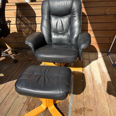 (der er dog slidt noget af på begge armlæn, men god stol med skammel til)