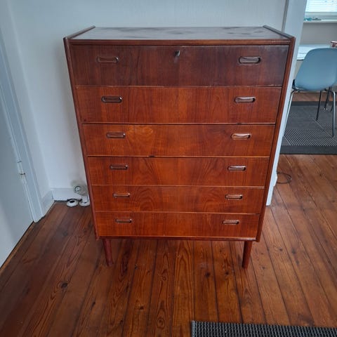 Entremøbel teaktræ, 60 år gl., b: 63 d: 30 h: 678, Entrémøbel, kommode med skab, teaktræ, retro, 3 skuffer, 1 skab med skydelåge og lille indvendig hylde. Måler 67,5 i højden, 63 cm i bredden og 29,5 cm i dybden. Meget velholdt, ikke vakkelvornt. Kan afhentes. (Bruger ikke Fiks færdig modellen).