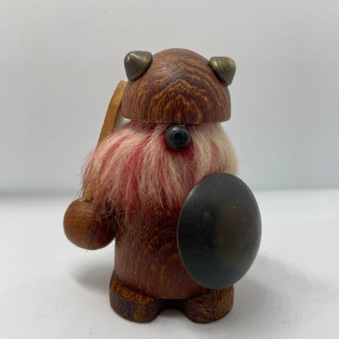 Træfigurer, Viking, Skøn gammel viking i teaktræ. Fuldt udstyret med sværd, skjold skæg kjortel i ægte skind samt hjælp med bord. Flot og velholdt