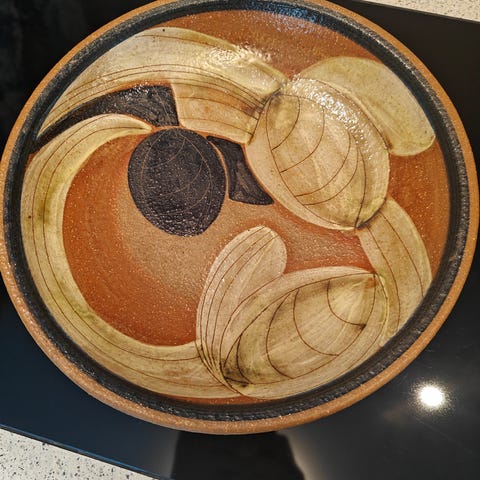 Skålen/fadet er flere forskellige nuancer med et fint cirkelmønster i bunden.