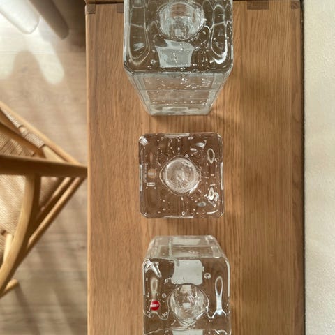 De to laveste: Højde ca. 8 cm. Vægt ca. 700 g for én lysestage
