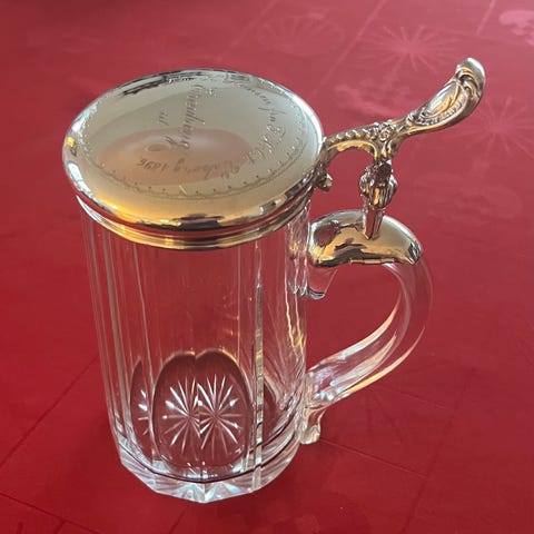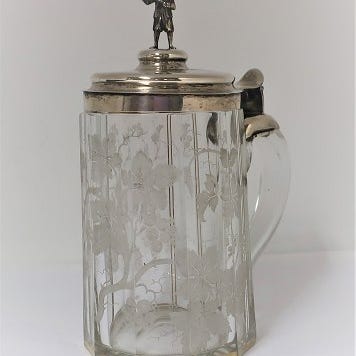 Mundblæst, emalje bemalet, monteret med tætsluttende gæk med FJP 1824 graveret i tinlåget.