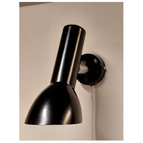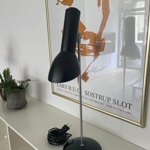 designet 1979 af arkitekt Tom Stepp, CPH Lighting. Matsort top og bund - stamme i rustfrit stål. Integreret afbryder i toppen, ca 3½ meter sort ledning.