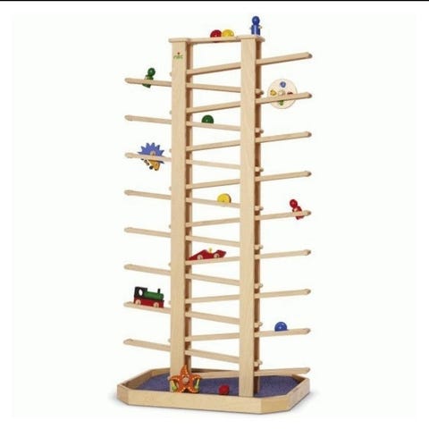 Biler, træfigurer og andre farverige elementer suser ned ad de lige baner og ender i en praktisk opsamlingsbakke, som samtidig bidrager til ekstra stabilitet.