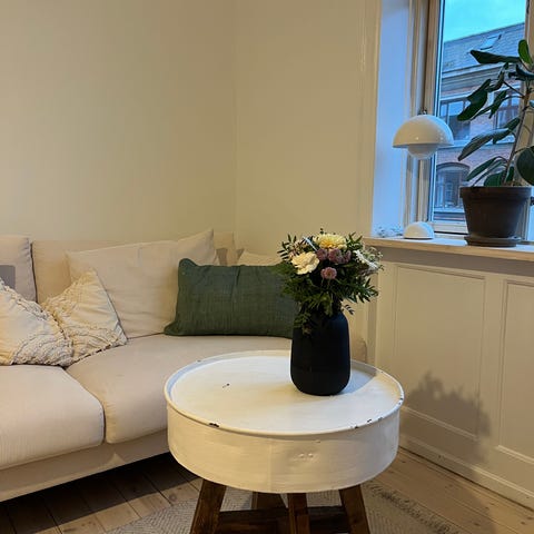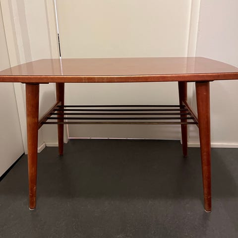 Med hylde til opbevaring af feks bøger eller blade. Malingen er afskallet flere steder så kunne godt bruge en ny gang maling.