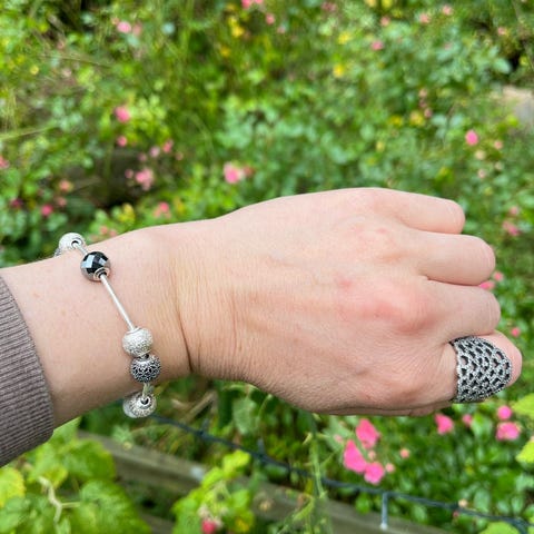 Armbåndet til venstre i billede med 3 armbånd og målebånd.