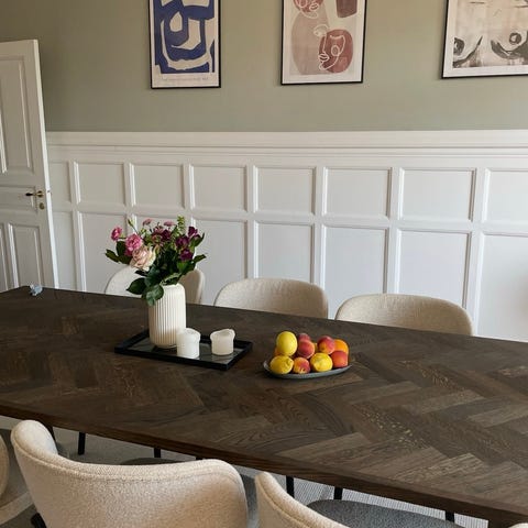 Stavlimet sildebensbord med håndsorterede stave i 6 mm mørkegrå olieret egefinér og massive egeben.