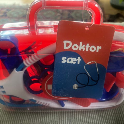 Tilbehør inkluderer (22 stk): stetoskop, briller, saks, sprøjte, termometer, skalpel, pincet, clips mv.
