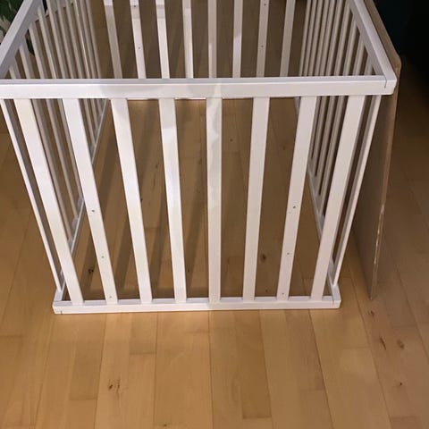 Krybbe, b: 84 l: 84, Ubrugt. Højde: 73cm, sengens højde kan justeres. Tremmeseng. Står og tager støv, så vi sælger den.