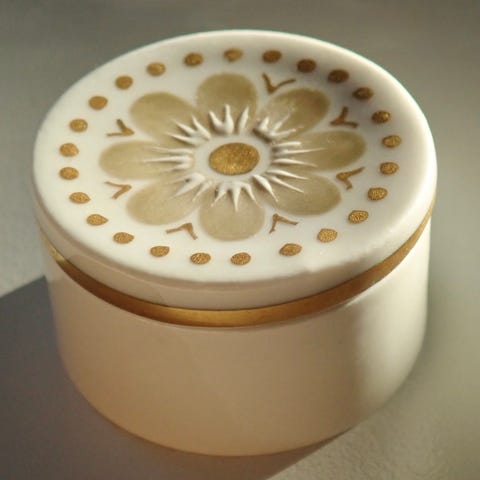 I fin stand uden skader, men med et lille skrab på lågets guldkant, der knapt kan ses …