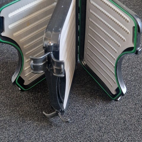 Flueæske, Perrine, Velholdt og rigtig pæn ældre Perrine flueæske med 15 super flotte Waddingtonfluer. Gode fluer til lakse- og havørredfiskeri.