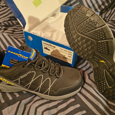 Goodyear Sikkerhedssko, Sikkerhedssko str. 45 af mærket Goodyear. Brugt ganske få gange, som tydeligt ses på billederne.