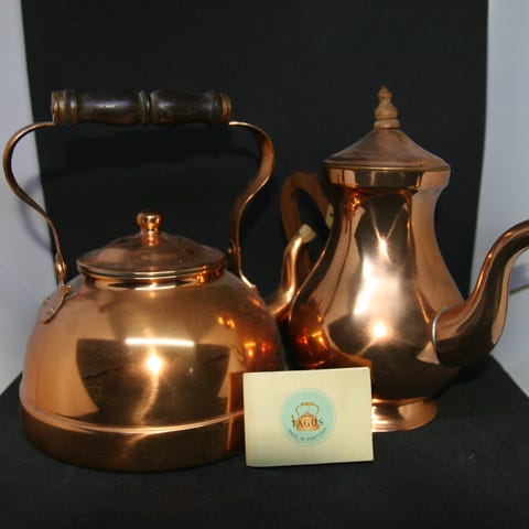 Kobbertøj, Tagus, Levynen, mfl, Tagus Chef (Portugal) Sauterpande R38 diameter 20 cm (200 kr) Sauterpande R76 oval mål 23,5x34 cm (200 kr) Kaffekande 2 liter (J.E. Levynen, Helsinki) (250 kr). Tekande (200 kr) Lille kande og krus (200 kr) Kobberpotte diam. 17 cm (200 kr) Lille messingskjuler diam. 10 cm (skaL renses for kalk) (50 kr)