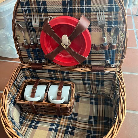 Hvis man er interesseret i picknic kufferten med indhold så skal det falde bud nu. Ellers kasseres den.