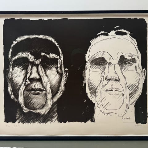 Collage, tryk, maler, Kirsten Beyer, motiv: Sprællemænd, b: 20 h: 34, Kirsten Beyer 1982