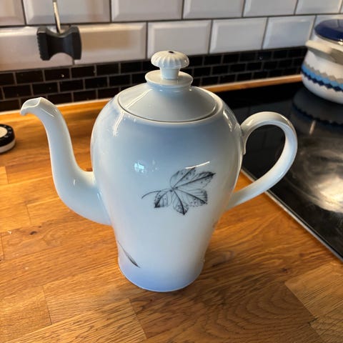 Alt = 2 x tekander (nr. 238 + 92), 2 x kaffekander (begge nr. 91A forskelligt mønster), flødekande (nr. 189), sukkerskål (nr. 94) og lille fad (nr. 52D)