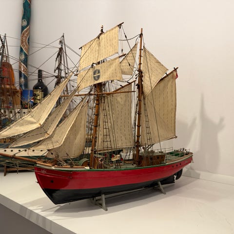 Modellen er restaureret med nyt tovværk og skib + sejl renset af model bygger.