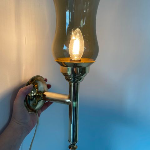 væglampe, Lampet med holder i messing og skærm i opalglas.