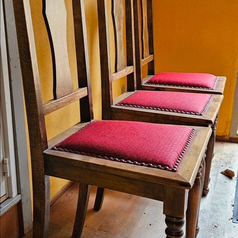 4 stk. antikke stole med rødt velourbetræk som mangler lidt finish, (pyntebånd o.l.) men man sidder godt på dem