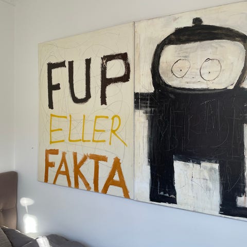 Akryl maleri, Poul , motiv: Statement, b: 80 h: 120, Poul Pava 'Man blir til sort hvis man tror på alt og glemmer at tro på sig selv'