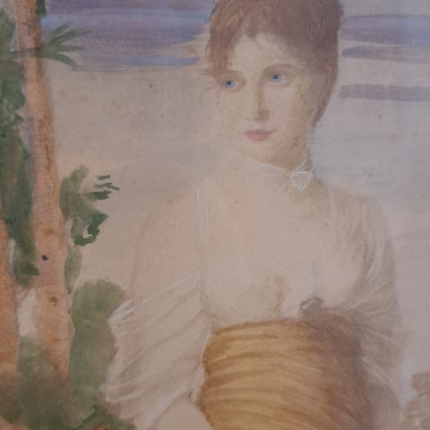 Maleri, Meget smukt akvarel potræt maleri af den bedårende franske Marie Antoinette i de skønneste pastelfarver. ( Fra ca.år 1910 )