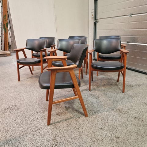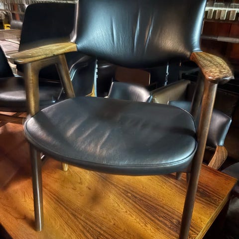 Anden arkitekt, Erik Kirkegaard Model 43, 2 stk, Renoveret med nyt skum og læder. Egetræ med patina og glød. Monteret med 2 cm ekstra tyk fast hynde. Fantastisk siddekomfort. Sælges kun sammen.