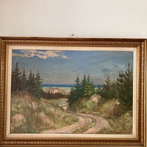 Oliemaleri, Grønnegaard Margit, Pige med hund maleri Bornholm bornholms kunsthandel kan sendes 24/6