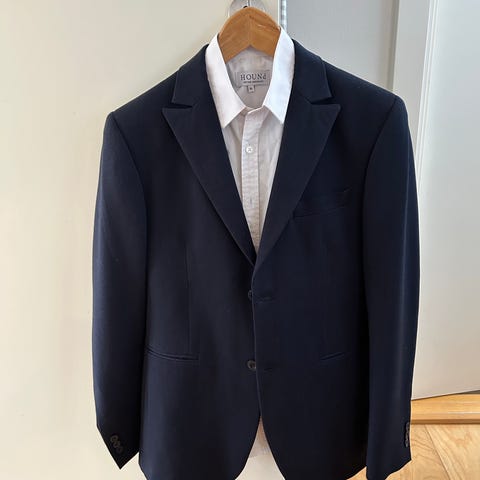 Jakkesæt, Hound, str. L/XL - 160cm, Flot og velholdt sort jakkesæt/konfirmationstøj fra ikke-rygerhjem. Ingen pletter eller huller. Er som nyt - kun brugt en gang. Jakken er str. L og bukserne str. XL (bukserne har mulighed for justering i livvide). Tøjet vil passe til ca. højde 160 cm.