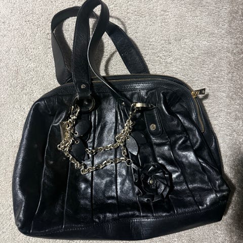 Sort taske med 2 slags remme, både håndtag, og en lang strop til at tage over skulderen.
