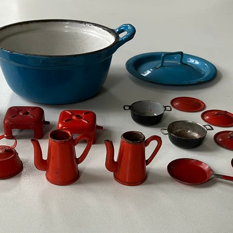 Dukketilbehør, Tekno køkken, Gasbord m. 2 gasblus, gasovn, gryde m. låg, kedel, vægt,, kaffekande, æbleskivepande og alm. pande.
