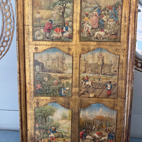 Billede, Ældre billede i ramme. Efterårsstemningsbillede fra landet med bondehuse, høstakke og en lille kone, der står ved grusvejen. Måske venter hun post vognen, der ses i baggrunden. Tryk på masonit. Bagsiden beklædt med brunt papir. Med ophæng. Signeret, men jeg kan ikke tyde signaturen. Måler 67x55cm