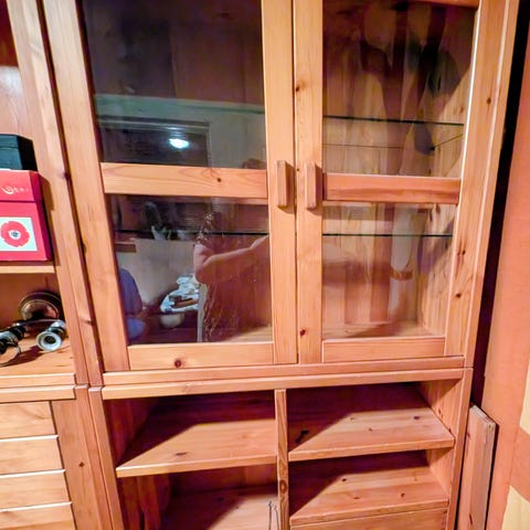 Anden reol, Stokke, b: 180 d: 60 h: 175, Kirsebær. 2 opbevaringskasser medfølger. Ekstra topreol uden bund kan medfølge hvis ønskes. Der er 2 sidestillede reoler, der kan stå sammen (180 cm bred) eller separat opstilling (2x 90 cm). Brugt men godt.