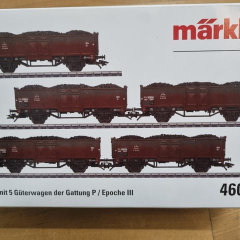 Modeltog, Märklin Personvogne, skala 1:87, Velholdte person- og pakvogn fra DB. introduceret i Märklins kataloger i 90'erne. Der er 1 personvogn 1.kl, 2 personvogne 2.klasse og en pakvogn, alle desværre uden æsker.