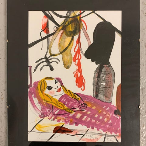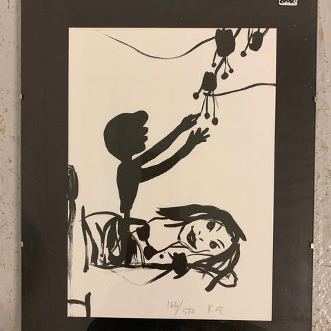 Litografi , Kathrine Ærtebjerg, motiv: Bogstav med illustration, b: 64 h: 50, Flot litografi af Kathrine Ærtebjerg. Professionelt indrammet med passepartout. Signeret KÆ. 215/230 2005.