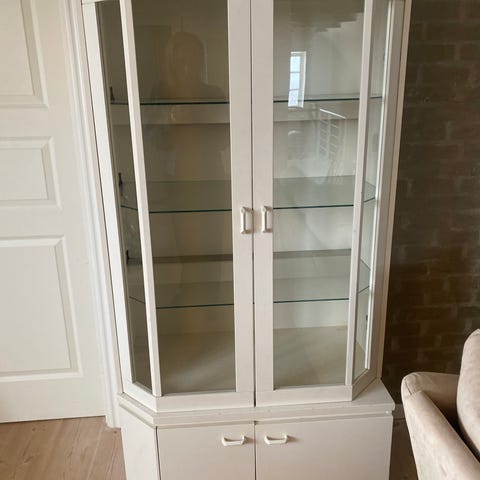 Første billede: Øverste sektion 119 cm høj med glaslåge og indvendig lys. Nederste skab 54 cm høj.