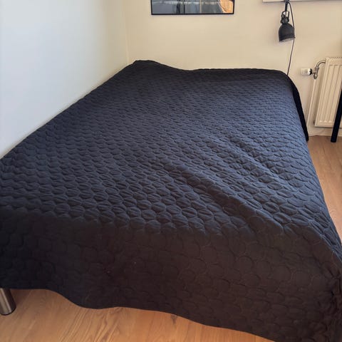 Sengen på billedet er 200x160, så tæppet passer til flere senge mål.