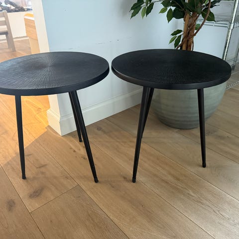 Bord, SØBORG MØBLER, 2 HALVRUNDE BORDE OG 1 MELLEMBORD, MED SKRUER PÅ HVERT BEN TIL JUSTRING MÅL B140 total længde 210 hver halvrund er 70 x140 HØJDE 73 + justering, bordplade er laminat